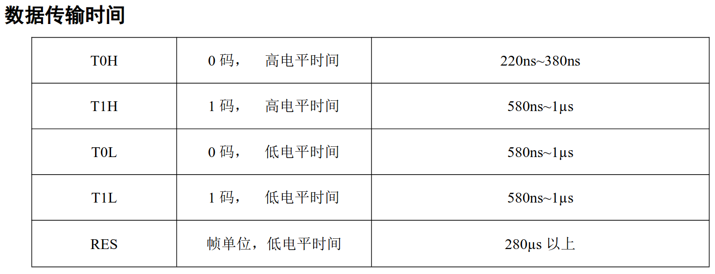根据WS2812的通信协议,00的高电平持续时间为220ns380ns,1的高电平持续时间为580ns1us,低电平持续时间均为580ns~1us。