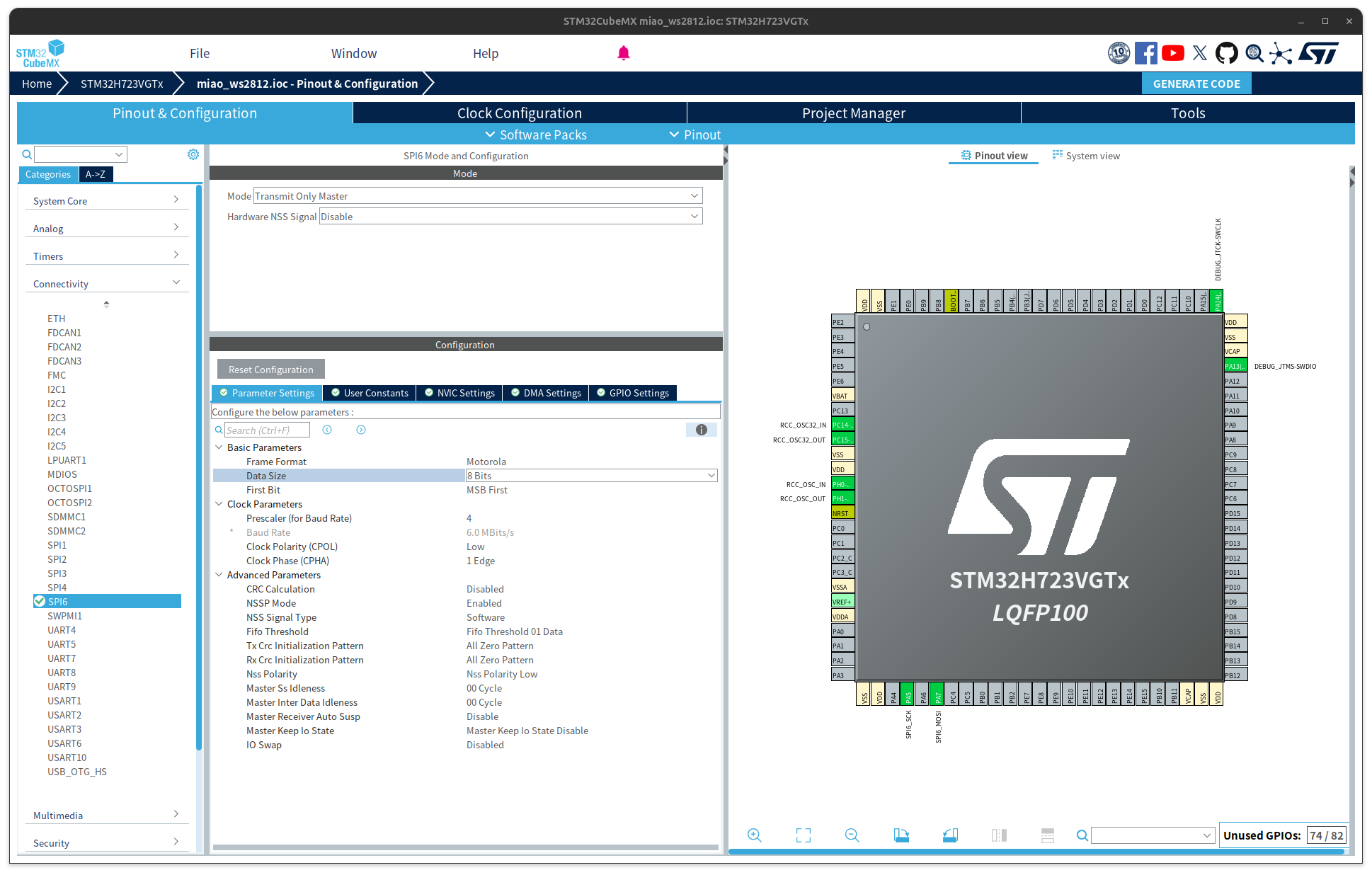 2000ns,频率为500kHz800kHz。 - SPI的时钟频率是数据位频率的8倍,所以SPI的时钟频率范围为4MHz~6.4MHz,理论来说在这个范围内都可以正常工作,但建议不要太接近上限,以免出现时序问题。本文中我选择参考达妙MC-02开发板例程,将SPI时钟频率设置为6MHz。