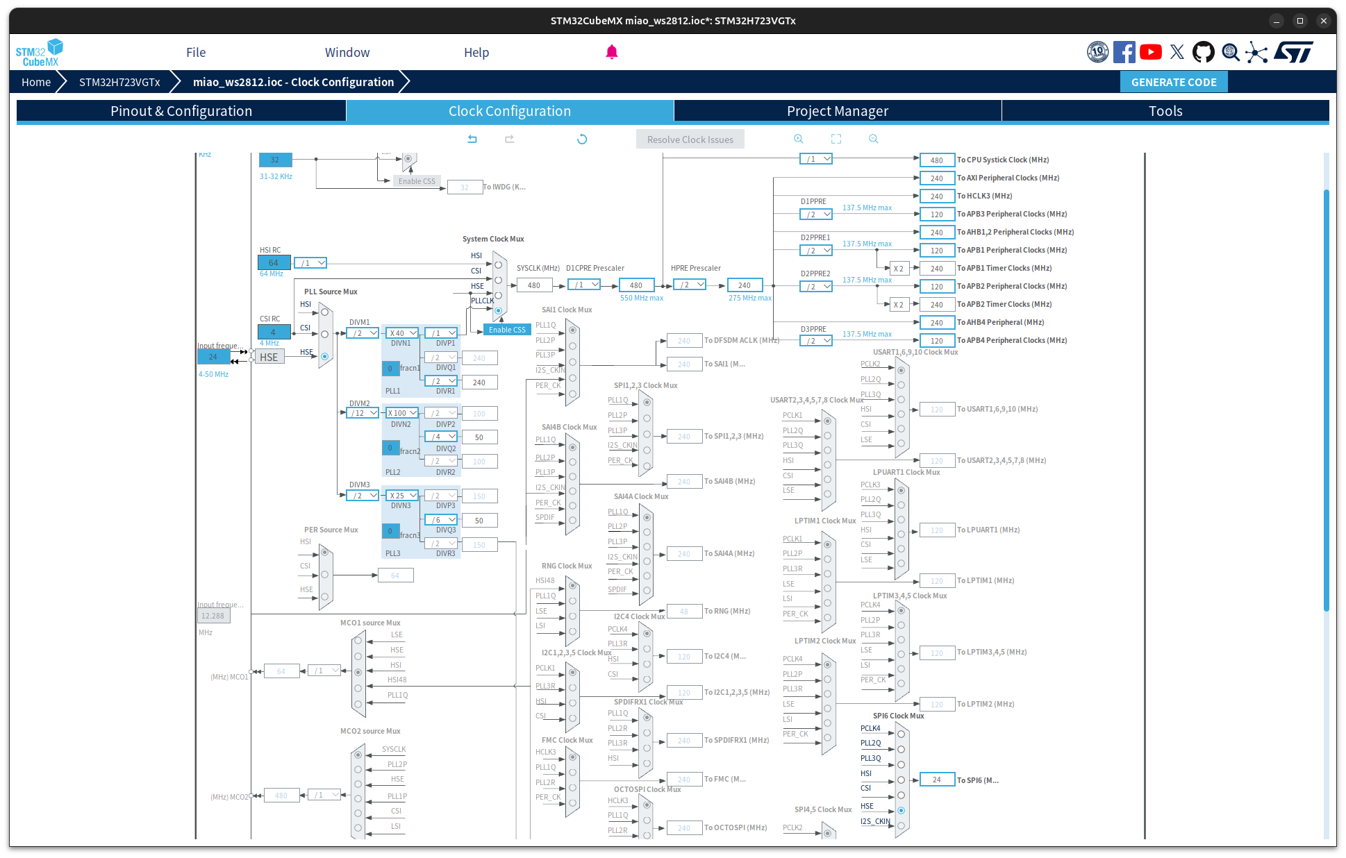 我使用的是达妙MC-02开发板,时钟树及SPI配置如下: